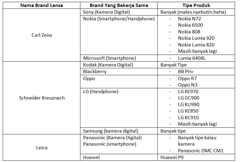 Untuk era sekarang sih meski handphone atau smartphone bekerja sama dengan nama perusahaan tersebut tidak menyita perhatian banyak orang. Karena sebagian besar konsumen juga awam soal 3 brand lensa tersebut. Ditambah lagi nama brand pembuat handphone atau smartphone lebih dominan ketimbang nama lensa tersebut. Tapi setidaknya sejak tahun 2006an beberapa perusahaan handphone membuat taktik yang cukup kreatif agar produknya lebih dikenal. Ya seperti LG yang ternyata kerjasama dengan brand Schneider Kreuznach sudah sangat mesra. Terbukti banyak produk LG yang menggunakan lensa Jerman ini.